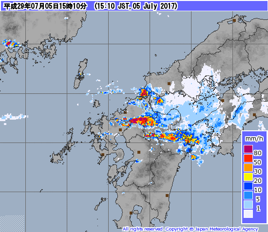 平成29年7月5日朝鮮半島南部から中国地方にのびていた梅雨前線がゆっくり南下して、6日昼過ぎにかけて九州北部付近に停滞しました。